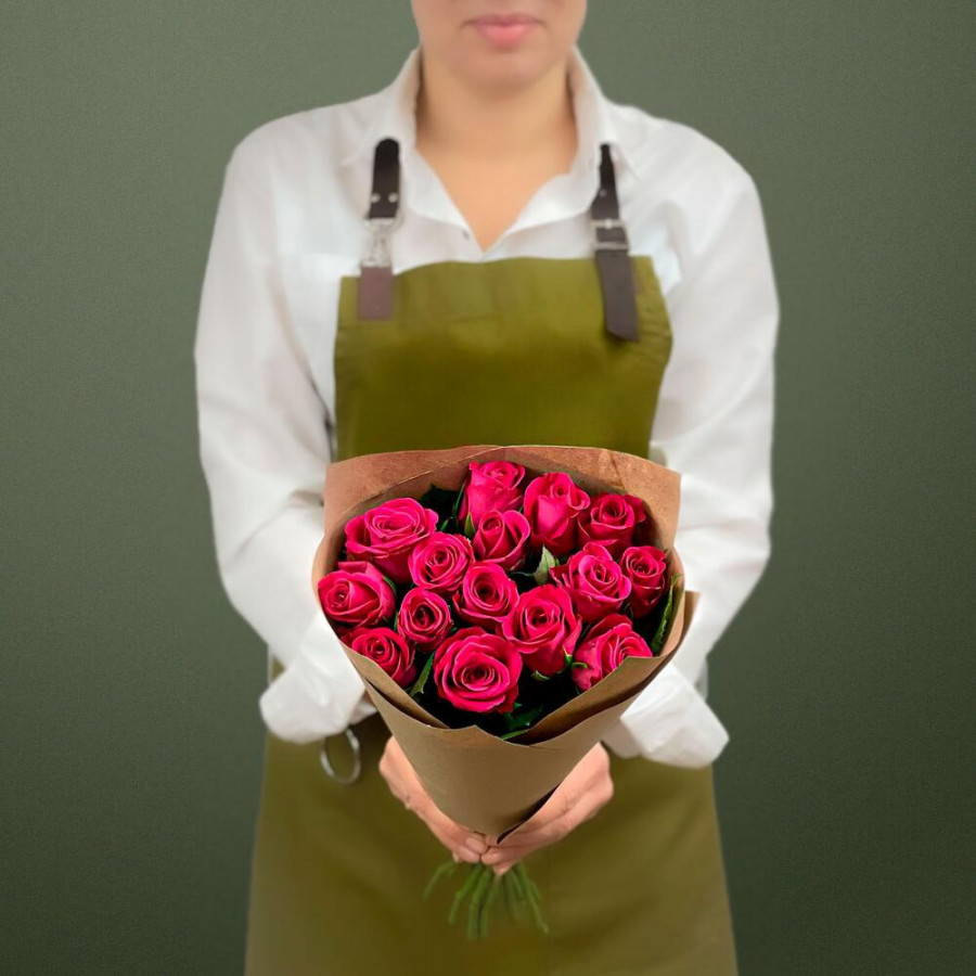 На фото букет из 11 малиновых роз. В составе: роза 11 шт, крафт-бумага 1 шт, атласная лента 1 шт, . Все цветы свежие и ароматные, букет красиво оформлен и отлично подходит для подарка. Доступна доставка цветов или самовывоз.
