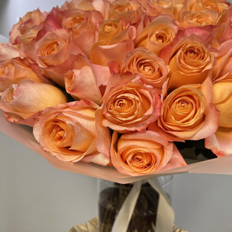 На фото букет из 75 коралловых роз. В составе: роза 75 шт, дизайнерская упаковка 1 шт, атласная лента 1 шт, . Все цветы свежие и ароматные, букет красиво оформлен и отлично подходит для подарка. Доступна доставка цветов или самовывоз.